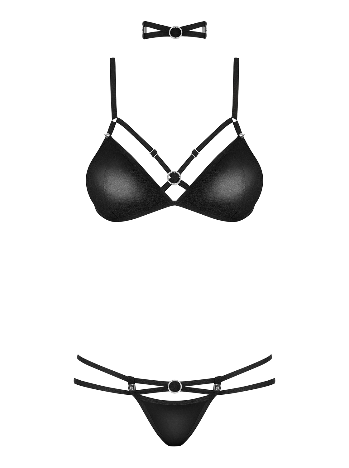 Damen Dessous Bänder BH Set String in schwarz glänzend mit Gummizüge und Metallring
