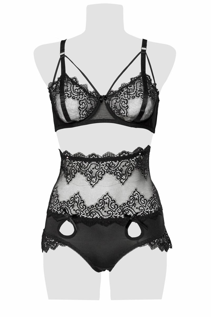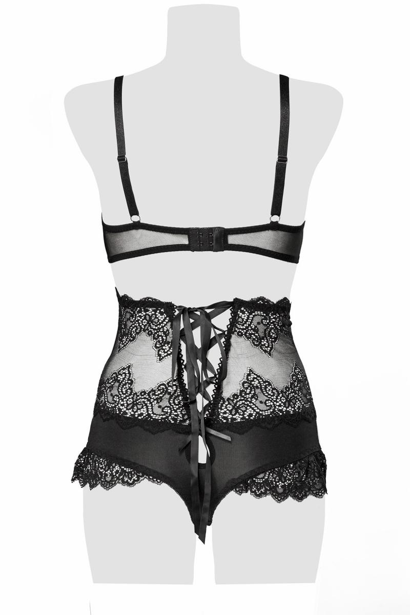 2-teilges Damen Dessous Set BH mit Hakenschluss und High Waist Panty Slip mit Schnürung aus Spitze s