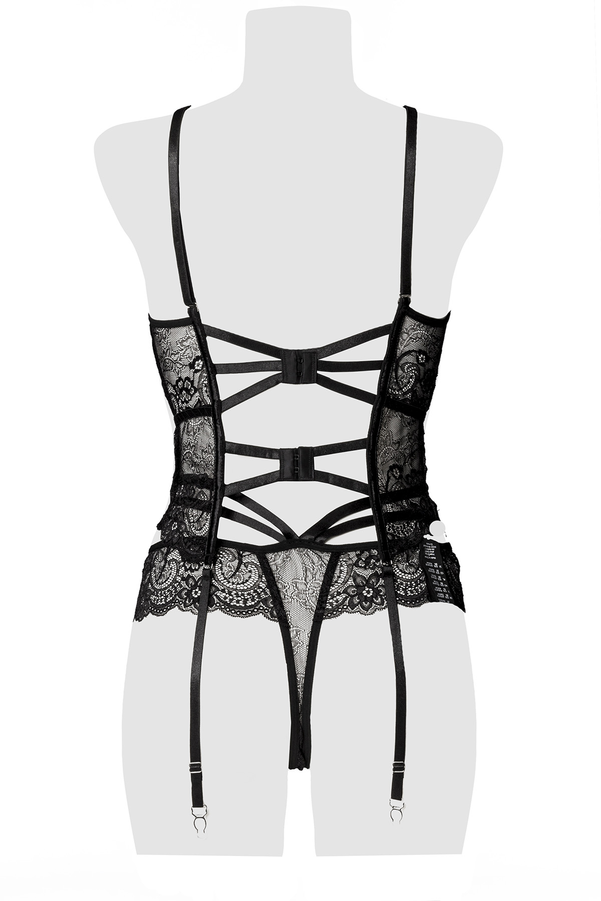 Schwarzes 2-teiliges erotisches Damen Dessous Set, gefertigt aus Gummibändern und Spitze. Bestehend aus Strapshemd und String. Dreifach verstellbare Hakenverschlüsse auf der Rückseite. Die abnehmbaren Strumpfhalter sind verstellbar.