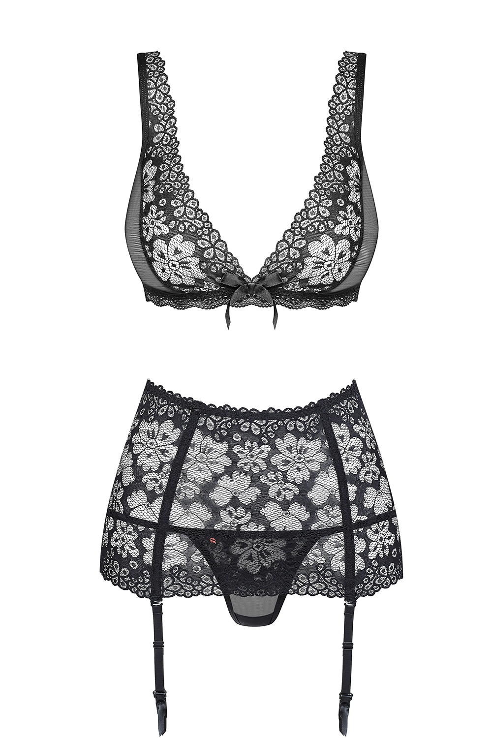 3-teilges Damen Dessous Set schwarz aus Netzmaterial und Spitze BH, Strumpfhaltergürtel und String t