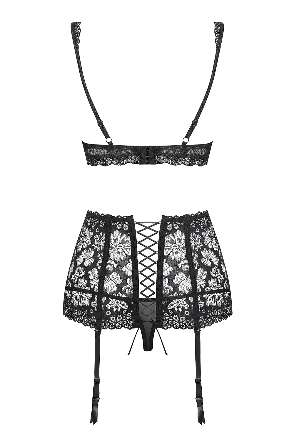 Erotisches Damen Dessous Set bestehend aus BH, Strumpfhaltergürtel und String, gefertigt aus transparentem, feinem Netzmaterial und Spitze. Die Träger und abnehmbaren Strumpfhalter sind verstellbar. Der BH hat einen dreifach verstellbaren Hakenverschluss und der Gürtel eine Schnürung auf der Rückseite. Der Artikel ist in einer Box mit Bild verpackt.Pflegehinweis : 30Grad Handwäsche Farbe : schwarzMaterial : 94% Polyamid / 6% Elastanerhältliche Größen : S/M, L/XL, 2XL