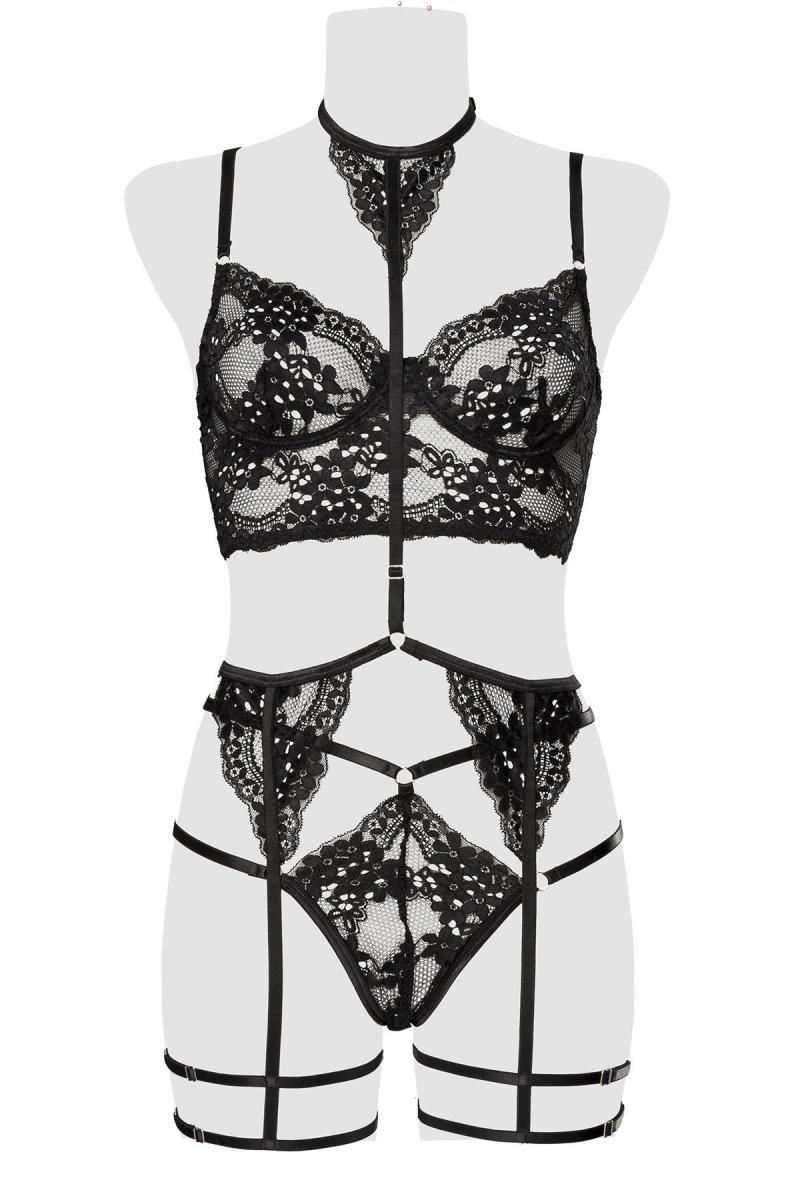 3-teilges Frauen Unterwäsche Spitzen Dessous Set aus Bügel BH, Kragenband mit Strumpfhalter und Slip