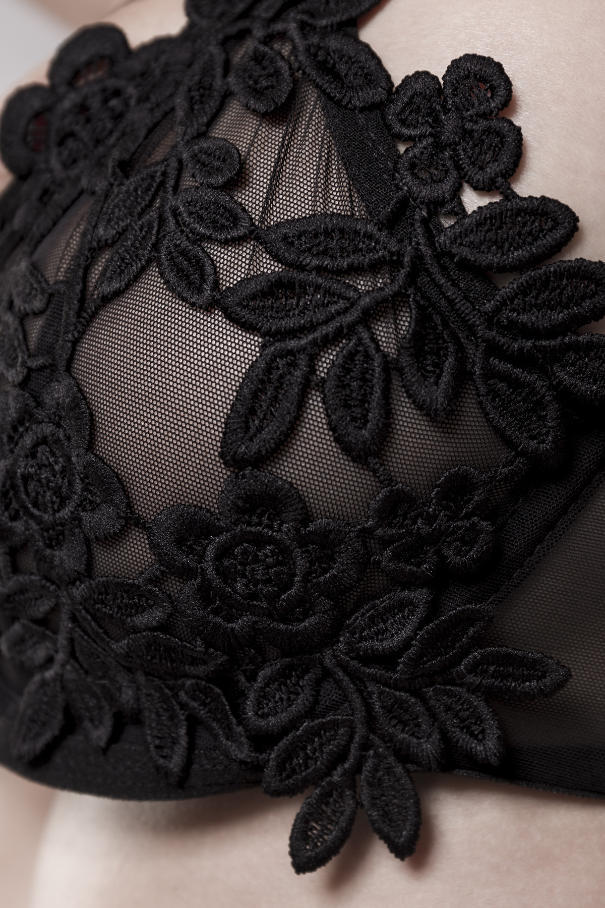 Schwarzes 3-teiliges Damen Dessous Reizwäsche Set, gefertigt aus dehnbarem Netzmaterial und Spitze.