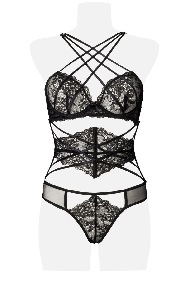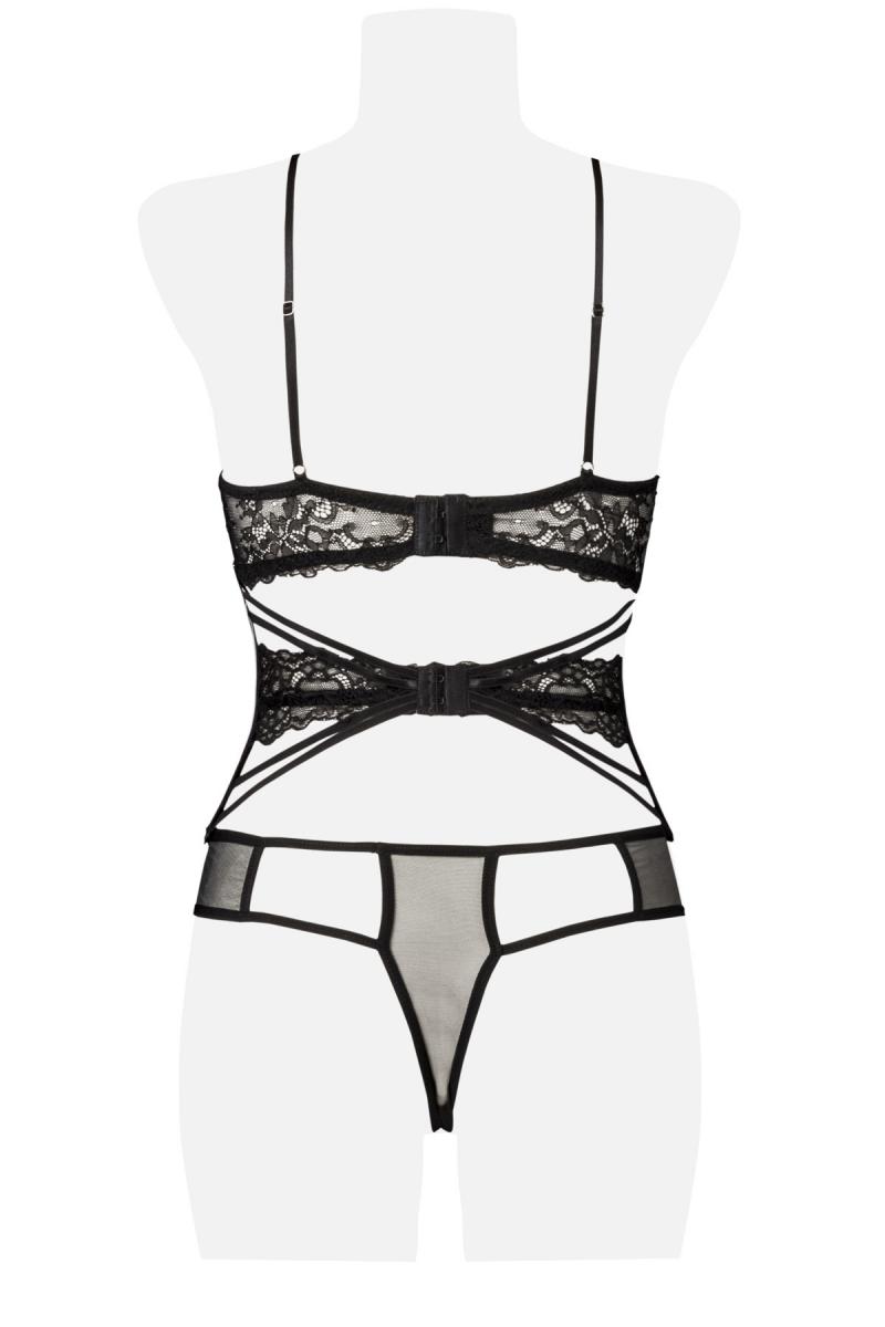 3-teiliges Set, gefertigt aus dehnbarer Spitze und Tüllmaterial. Die Träger sind verstellbar. Bauchgürtel und Bügel-BH haben einen verstellbaren Hakenverschluss auf der Rückseite.