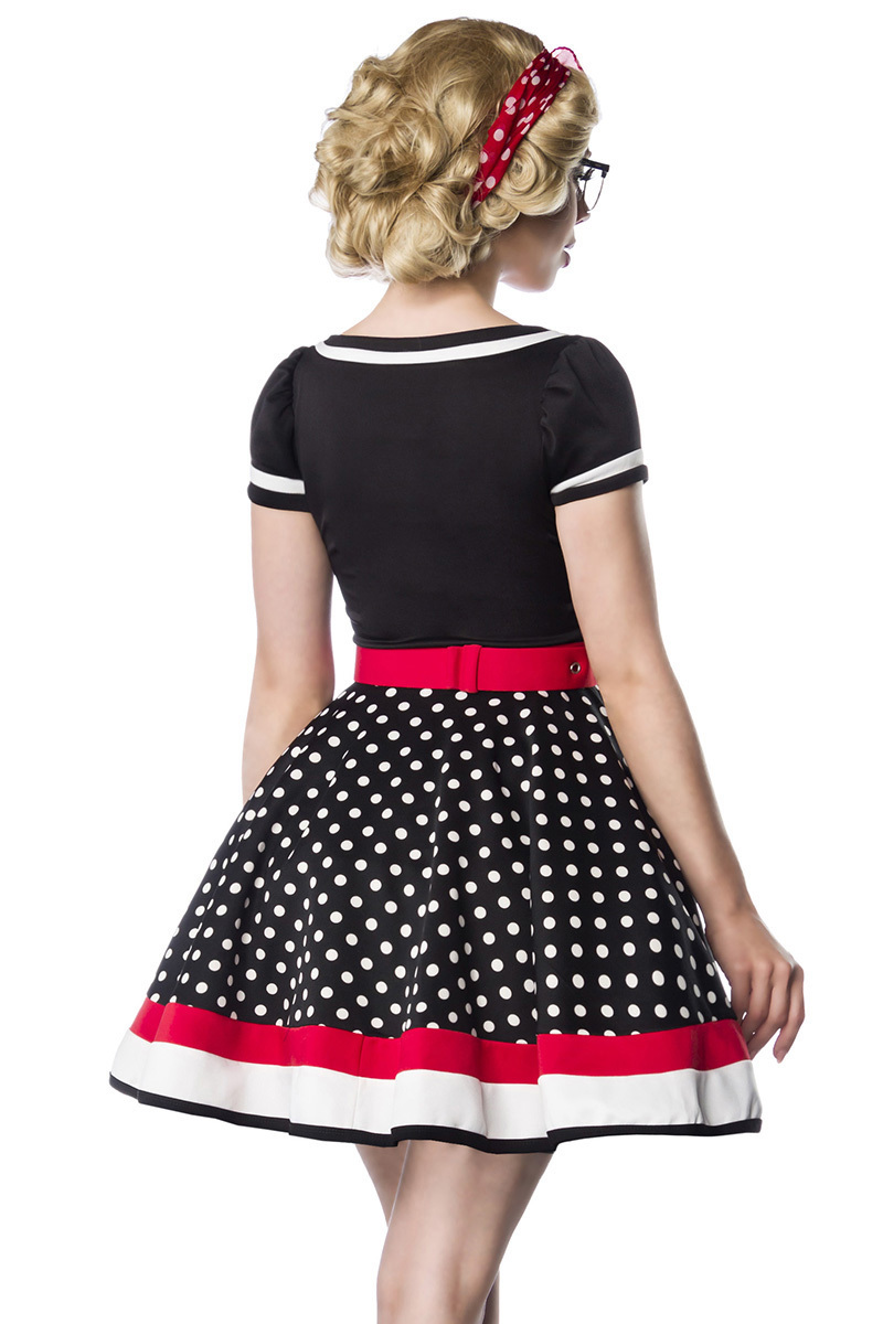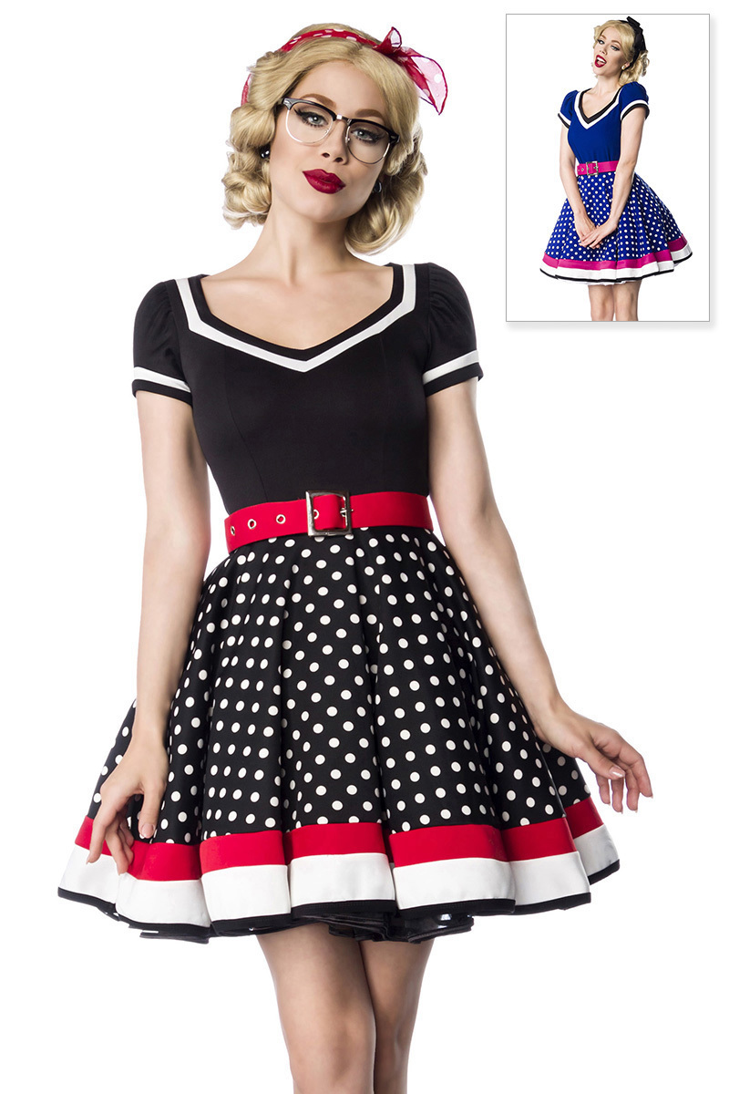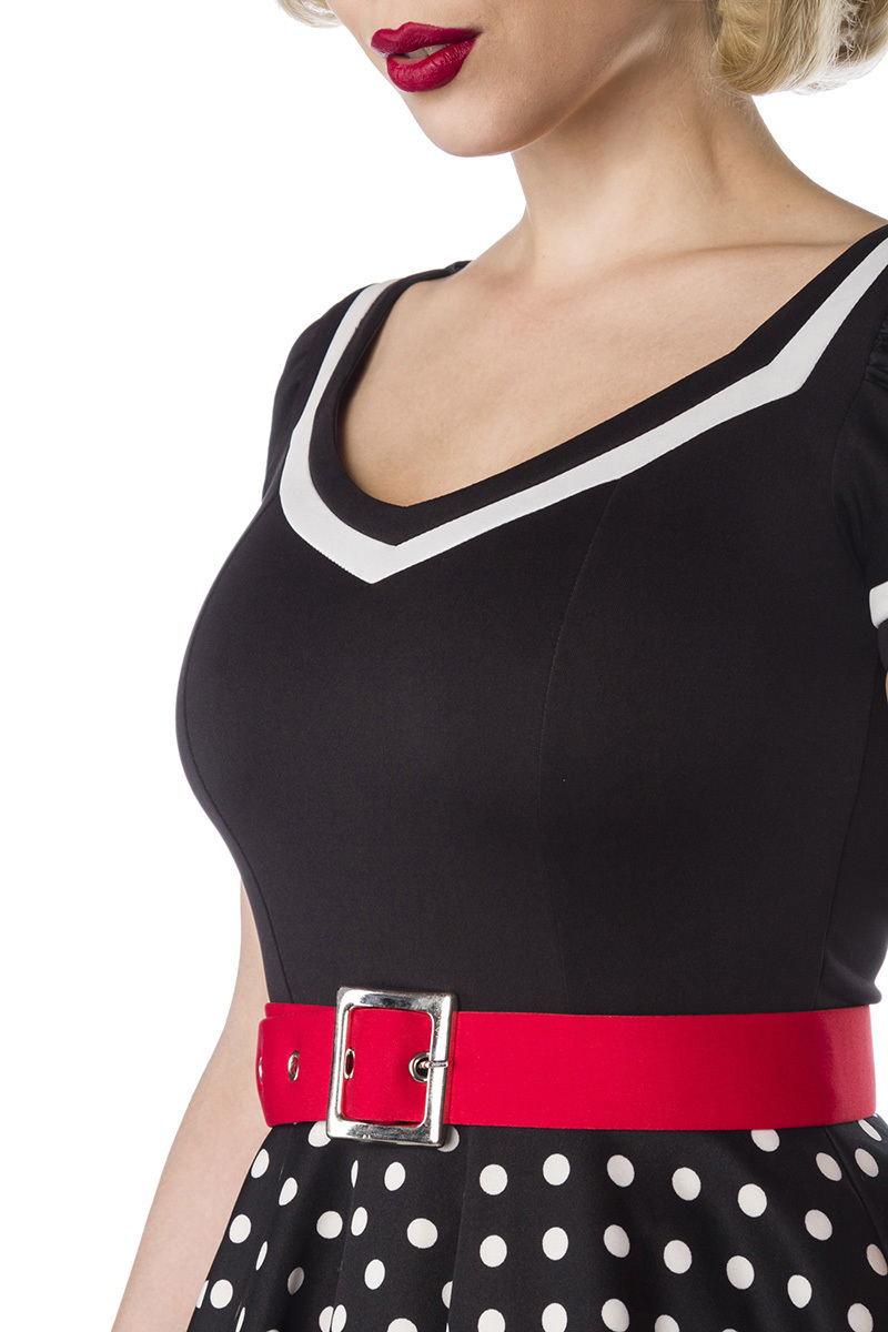 50er Jahre Damen gepunktetes Vintagekleid mit weiß schwarzen Streifen und rotem Gürtel im Marine Look ausgestellt50er Jahre Kleid im Retro Look mit Kurzarm Puffärmel, Tellerrock und V-Ausschnitt . Das Kleid hat ein gepunktetes Oberteil und ausgestelltes Rockteil. Teilungsnaht auf Taillenhöhe und rückwärtiger Reißverschluss.Inklusive verstellbarem 50er Jahre-Gürtel mit Dornschnalle. Gürtellänge von 67 cm bis 89 cm. Kleid ohne Petticoat. Angenehm weiches und hochwertiges Material. Gesamtlänge in Gr. S ca. 81 cm, der Petticoat ist nicht inklusive,hochwertige QualitätMaterial:80% Polyester, 20% Elasthan; Farbe:schwarz/rot/weiß; Lieferumfang:Kleid