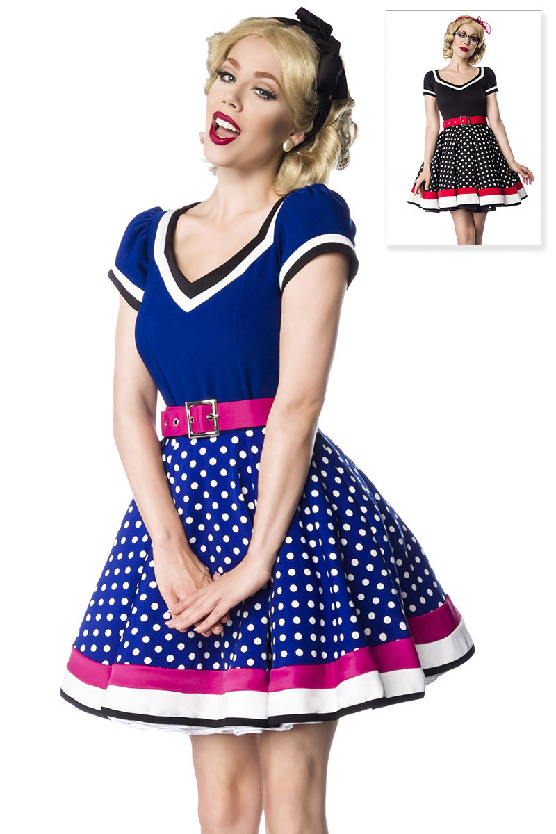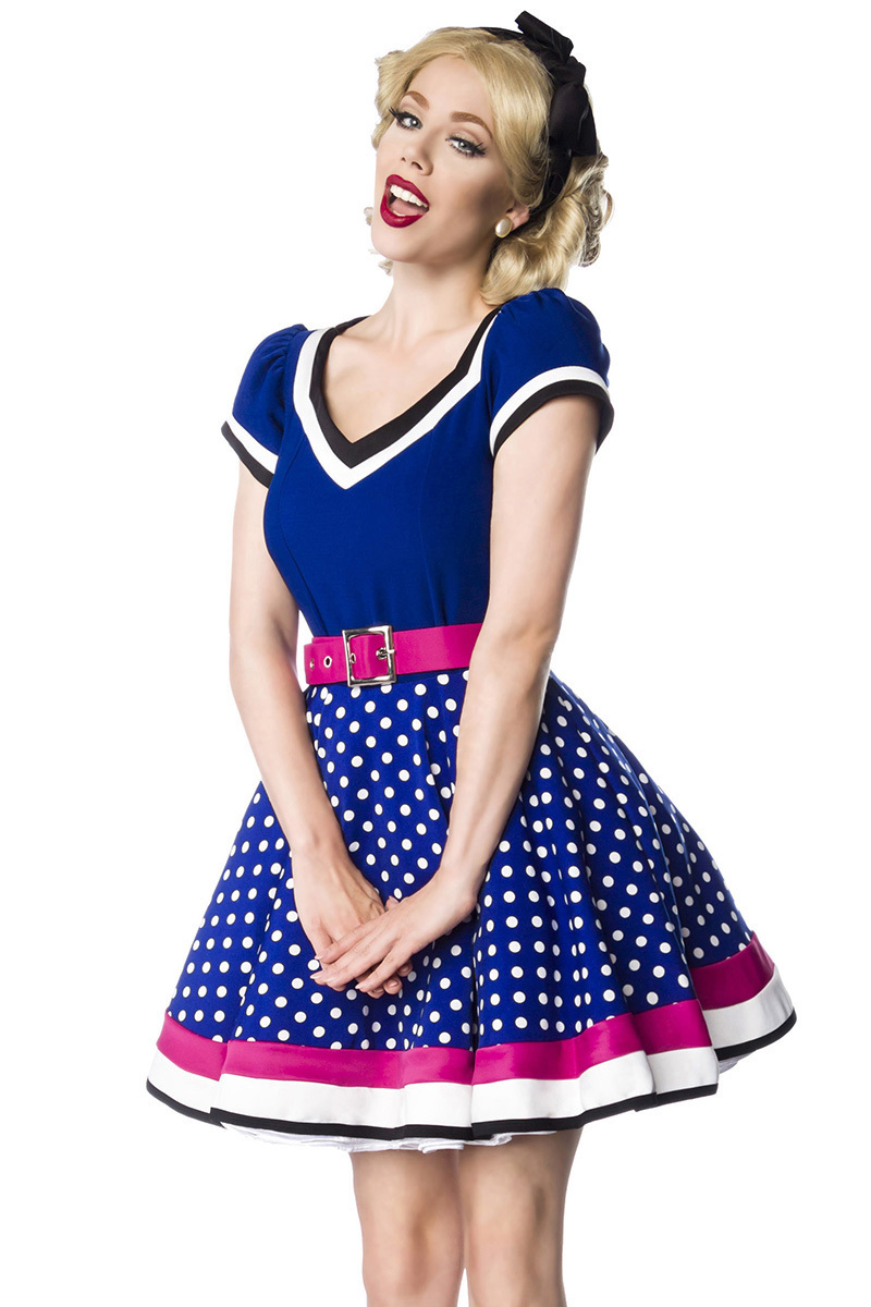 50er Jahre Damen gepunktetes Vintagekleid mit weiß rosa Streifen und rosa Gürtel im Marine Look ausgestellt50er Jahre Kleid im Retro Look mit Kurzarm Puffärmel, Tellerrock und V-Ausschnitt . Das Kleid hat ein gepunktetes Oberteil und ausgestelltes Rockteil. Teilungsnaht auf Taillenhöhe und rückwärtiger Reißverschluss.Inklusive verstellbarem 50er Jahre-Gürtel mit Dornschnalle. Gürtellänge von 67 cm bis 89 cm. Kleid ohne Petticoat. Angenehm weiches und hochwertiges Material. Gesamtlänge in Gr. S ca. 81 cm, der Petticoat ist nicht inklusive,hochwertige QualitätMaterial:80% Polyester, 20% Elasthan; Farbe:blau/rosa/weiß; Lieferumfang:Kleid