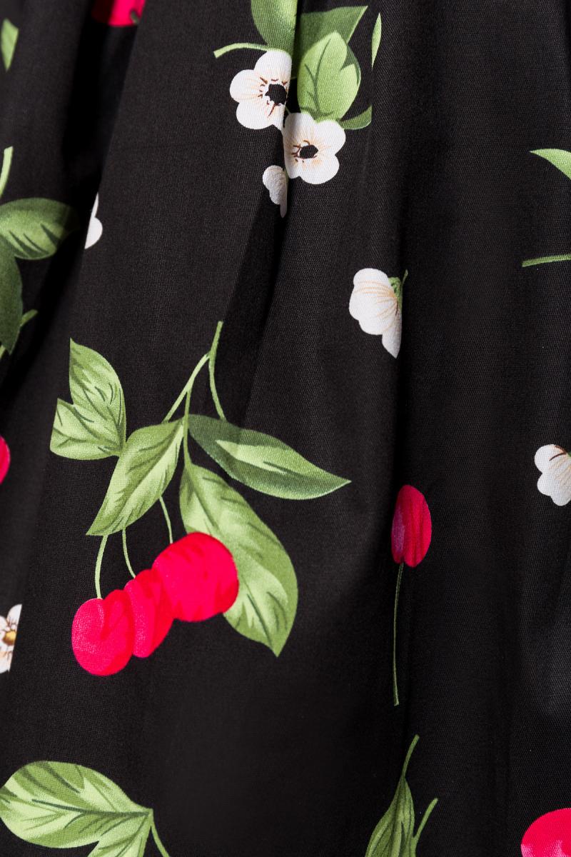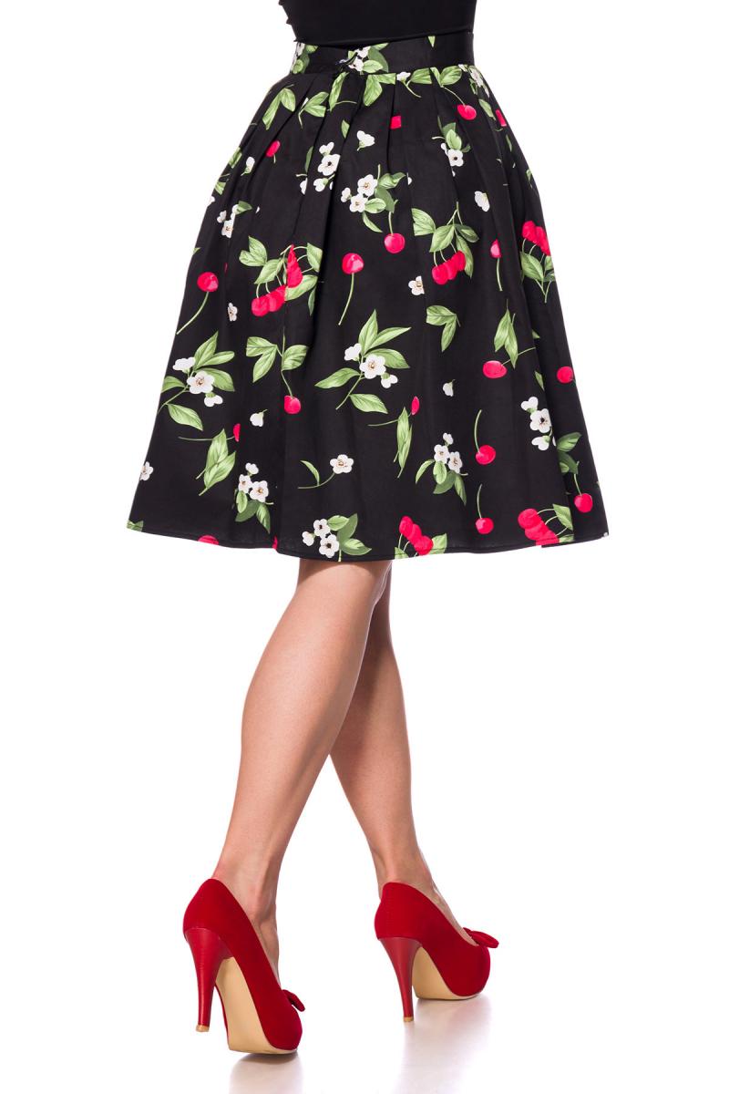 Schwarzer ausgestellter Vintagerock mit hohem Bund und Reißverschluss seitlich Blumenmuster knielang Rockabilly Rock Damen RetroToller ausgestellter Vintagerock Blüten und Kirschen, Knie umspielend und mit hohem Bund High Waist.Der Rock ist mit Blumenmuster mit angesetzten Kellerfalten und hat einen seitlichen Reißverschluss und ist aus angenehm weichem und hochwertiges Material. Farbe: Schwarz/bunt Material: 96% Baumwolle, 4% Elasthan; Lieferumfang:Rock