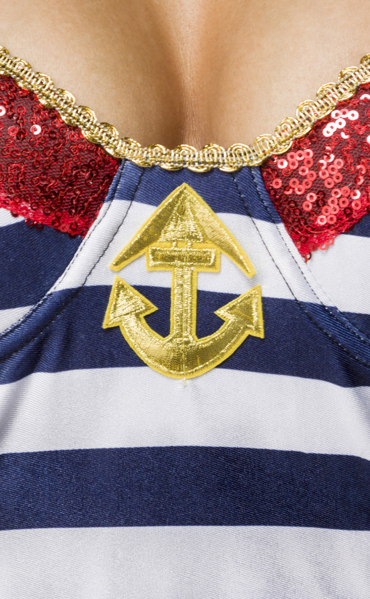 Weißes Damen Marine Kleid blau gestreift mit roten Pailletten inklusive Mütze Handschuhe Marine VerkleidungTolles Damen Marinekostüm aus weichem dehnfähigen Material und mit charakteristischem Matrosenstreifen. Das Kleid ist mit roten Pailletten verziert. Es hat gestreifte Abschlüsse an Schultern und Saum.Der Rockteil besticht mit tollen Raffungen, ein passendes Hütchen ist inklusive.Oberteil mit eingearbeiteten Push up Cups und seitlichen Lackeinsätzen, elastische Multistraps. Tolles ausgestelltes, mehrlagiges Rockteil mit Patches im Marinelook, Reißverschluss in der hinteren Mitte. Lackhalsband mit Anker inklusive, Handschuhe und passender String sowie Kapitänsmütze inklusive. Rückenlänge in Größe M ca. 66 cm