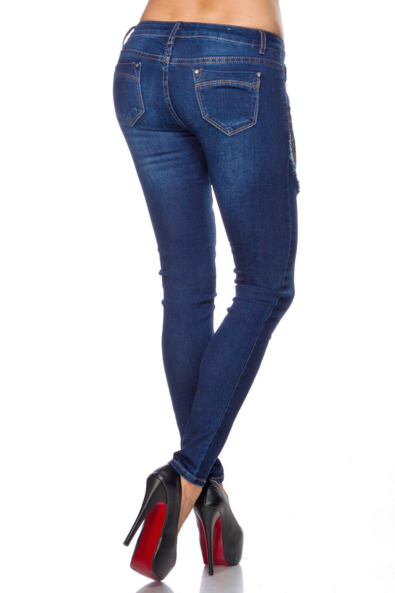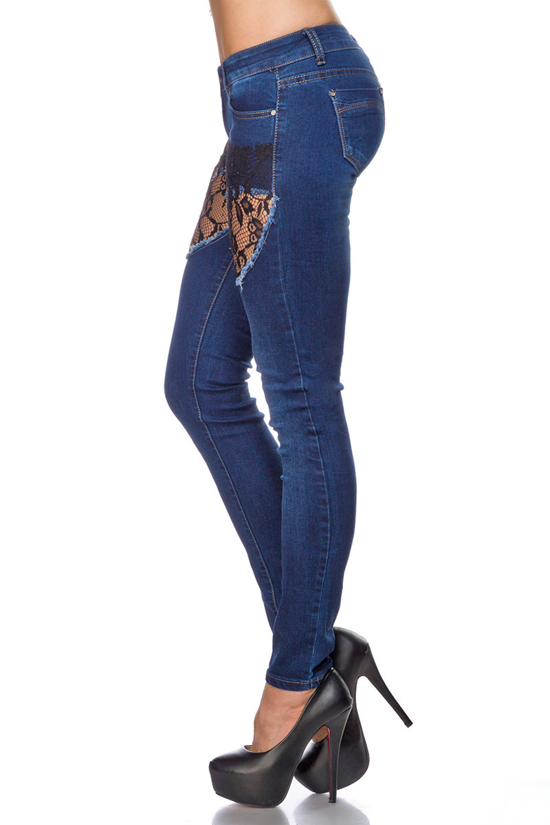 Produktinformationen "Blaue Damen Jeans mit Strass und Spitzeneinsätzen Five-Pocket-Style Röhrenjeans"