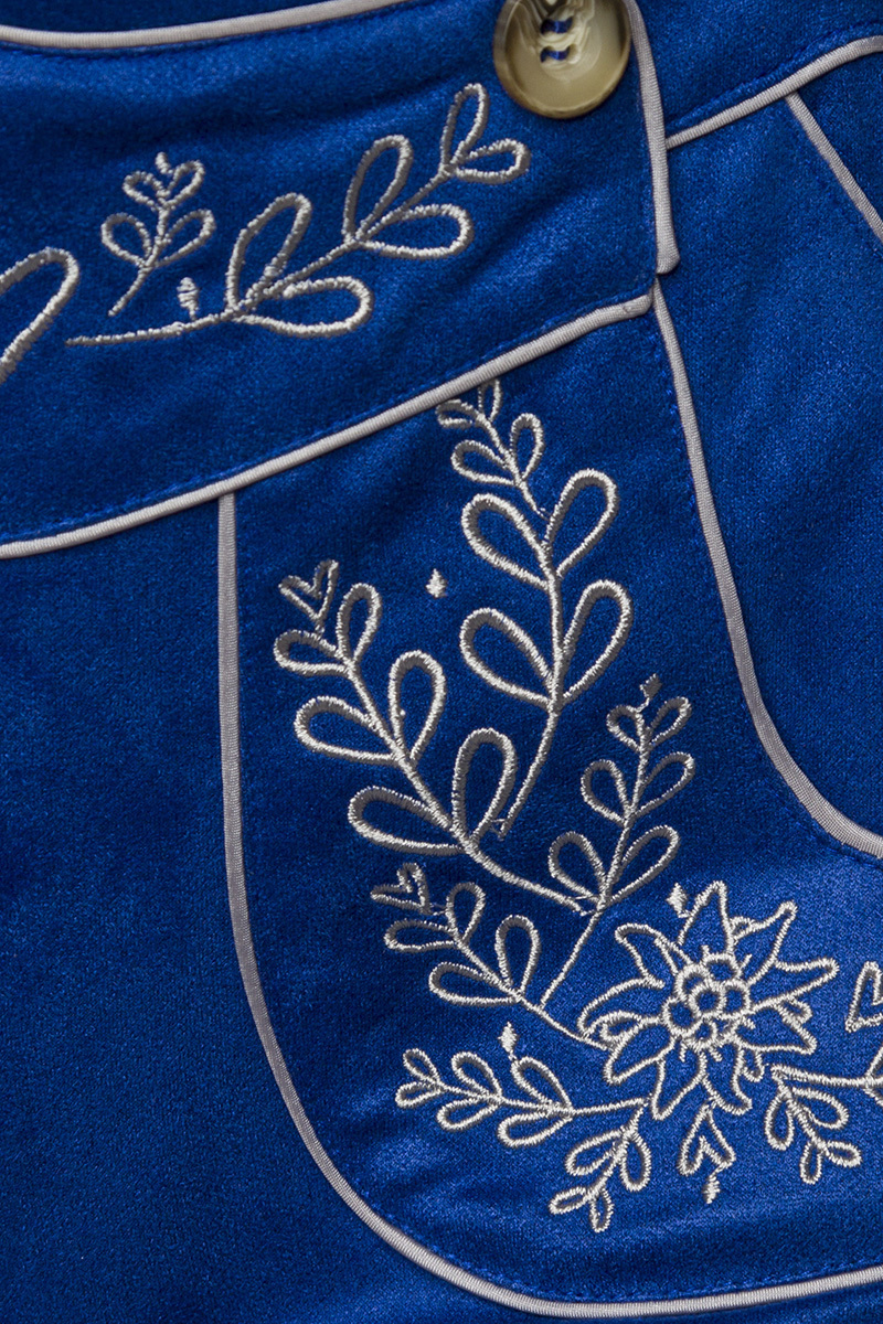 Produktinformationen "Blaue Damen Trachtenkniebundhose mit Hosenträgern und Stickereien Velourlsederoptik Bayrische Latzkn"