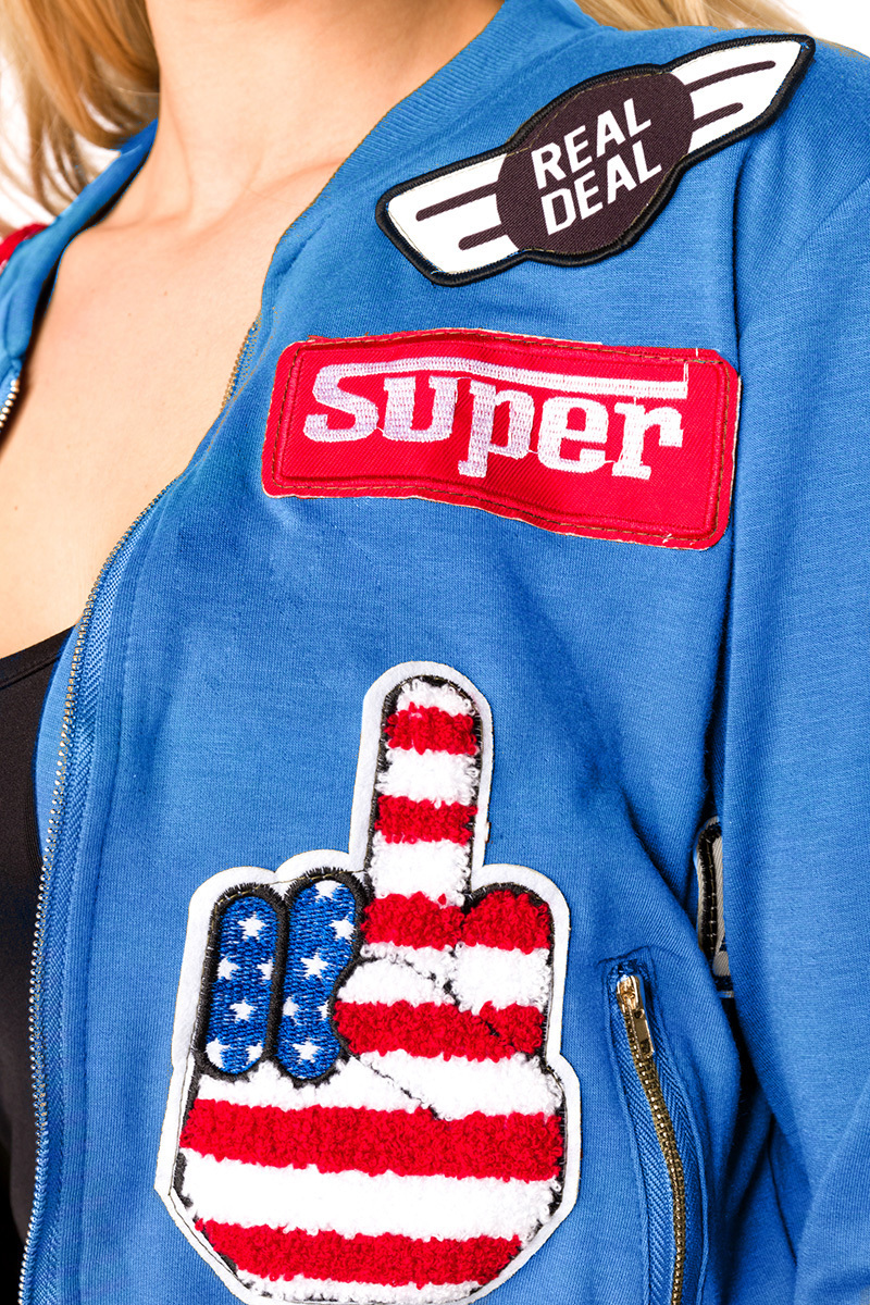Blaue kurze Damen Blouson Jacke mit langen Ärmeln und aufgenähte Patches Metallreißverschluss vorn b