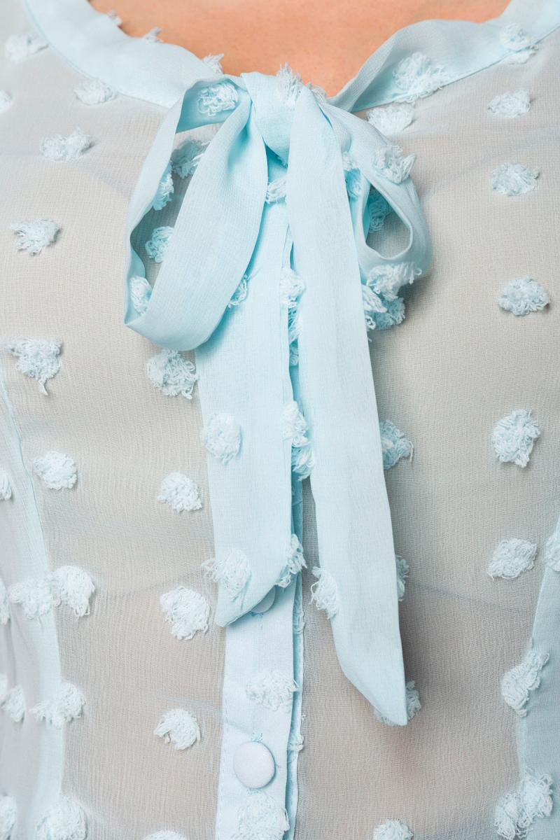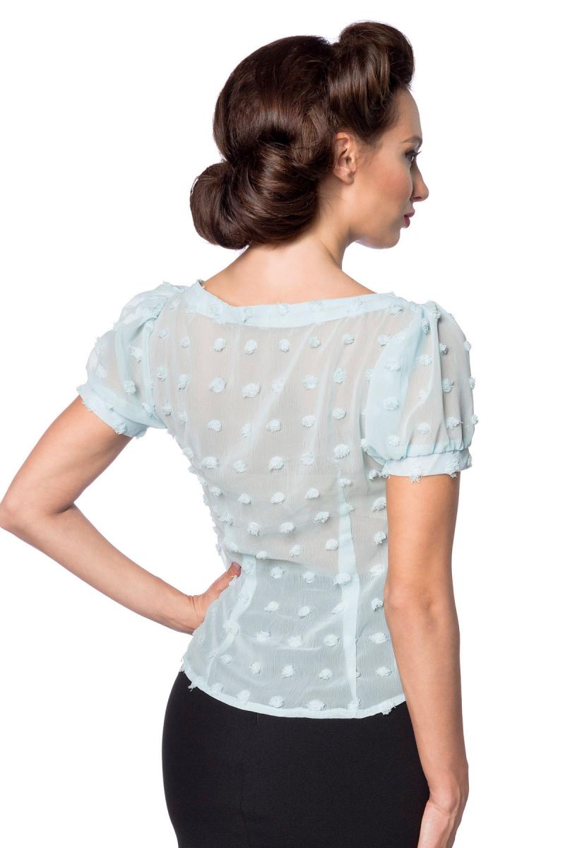 Blaue kurze Schluppen-Bluse mit kurzen Puffärmeln und Schleife transparenter Netzstoff Knopfleiste