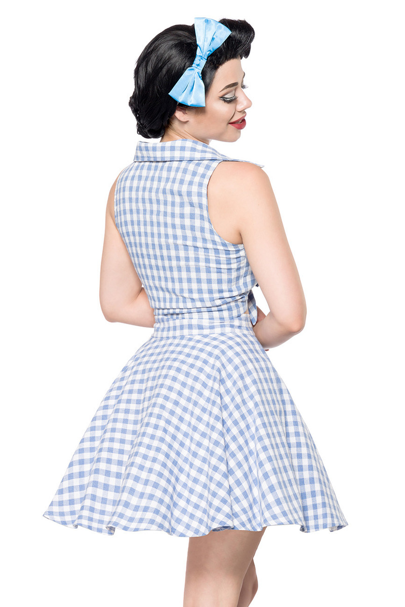 Blaue schulterfreie Bluse zum knoten ohne Ärmeln und mit Umlegekragen weiß kariert Retro-Top mit Knö