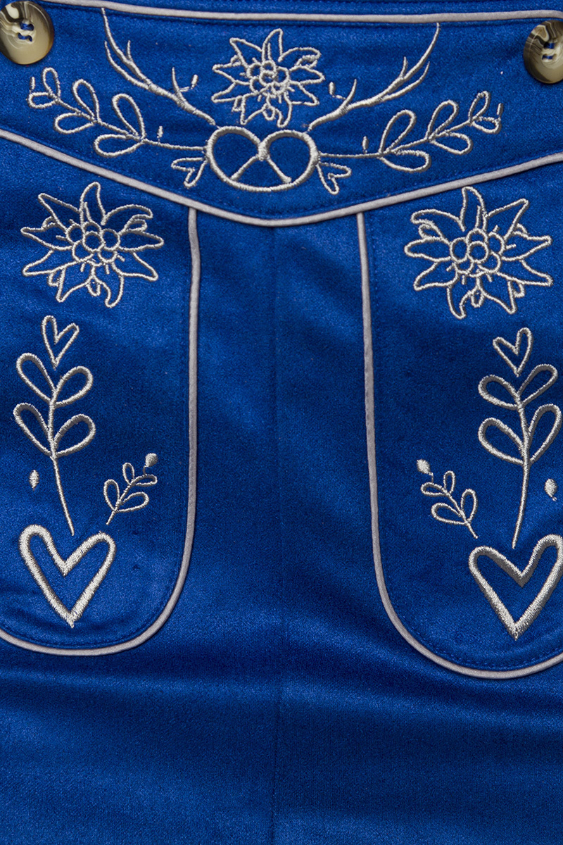 Produktinformationen "Blauer Damen Trachtenrock mit Hosenträgern und Stickereien Velourlsederoptik Bayrische Latzrock Lede"