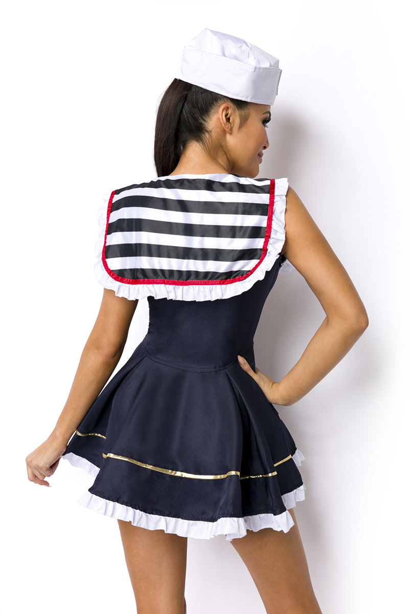 Blaues Damen Marine Kleid weiß gestreift mit weißen Schleifen inklusive Hut Marine VerkleidungTolles Damen Marinekostüm aus weichem dehnfähigen Material und mit charakteristischem Matrosenkragen. Das Kleid ist mit weißen Schleifen verziert. Es hat gestreifte Abschlüsse an Schultern und Saum.Der Rockteil besticht mit tollen Raffungen, ein passendes Hütchen ist inklusive. Inklusive String;Material:95% Polyester, 5% Elasthan; Farbe:blau/weiß; Lieferumfang:Kleid, Hütchen, String