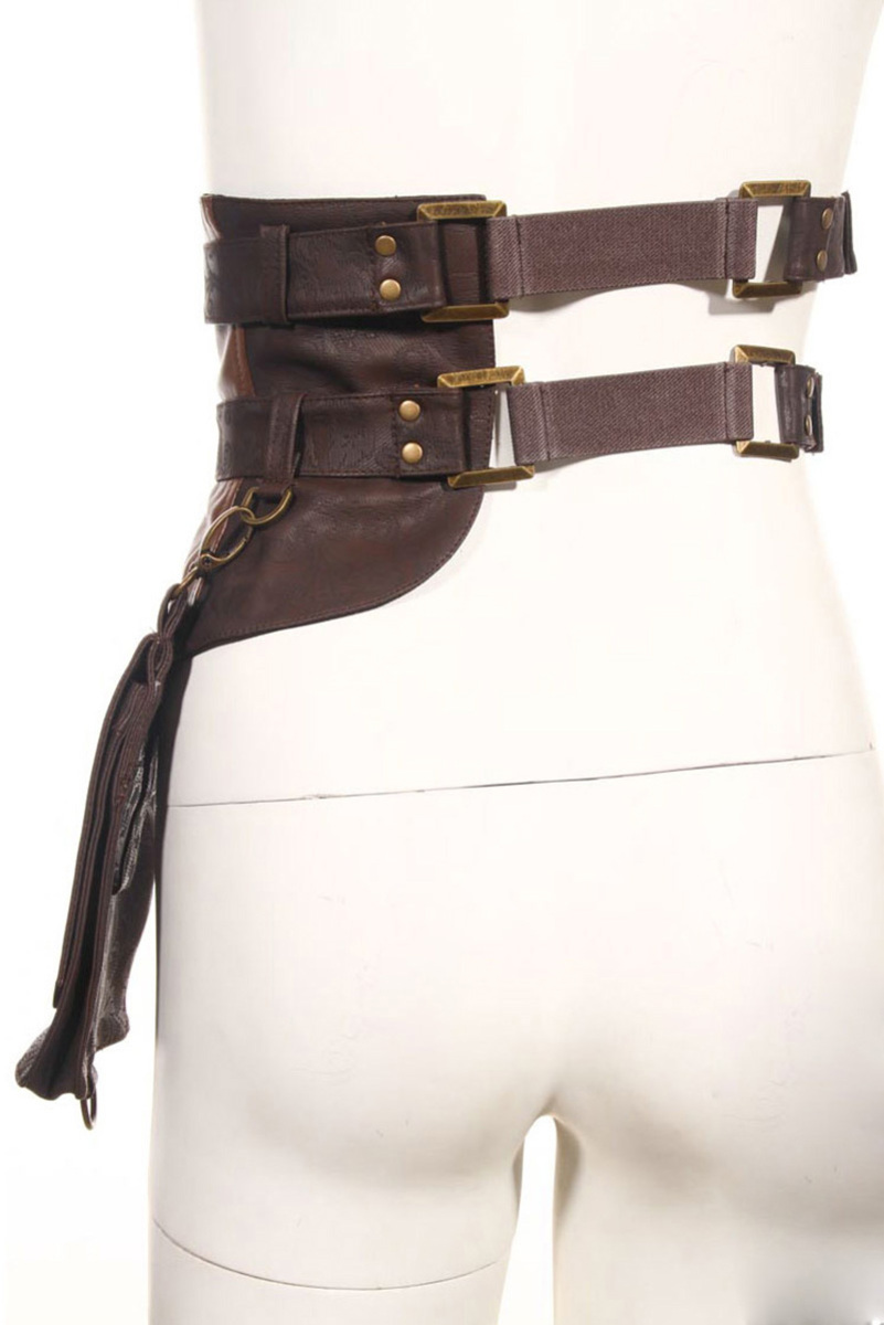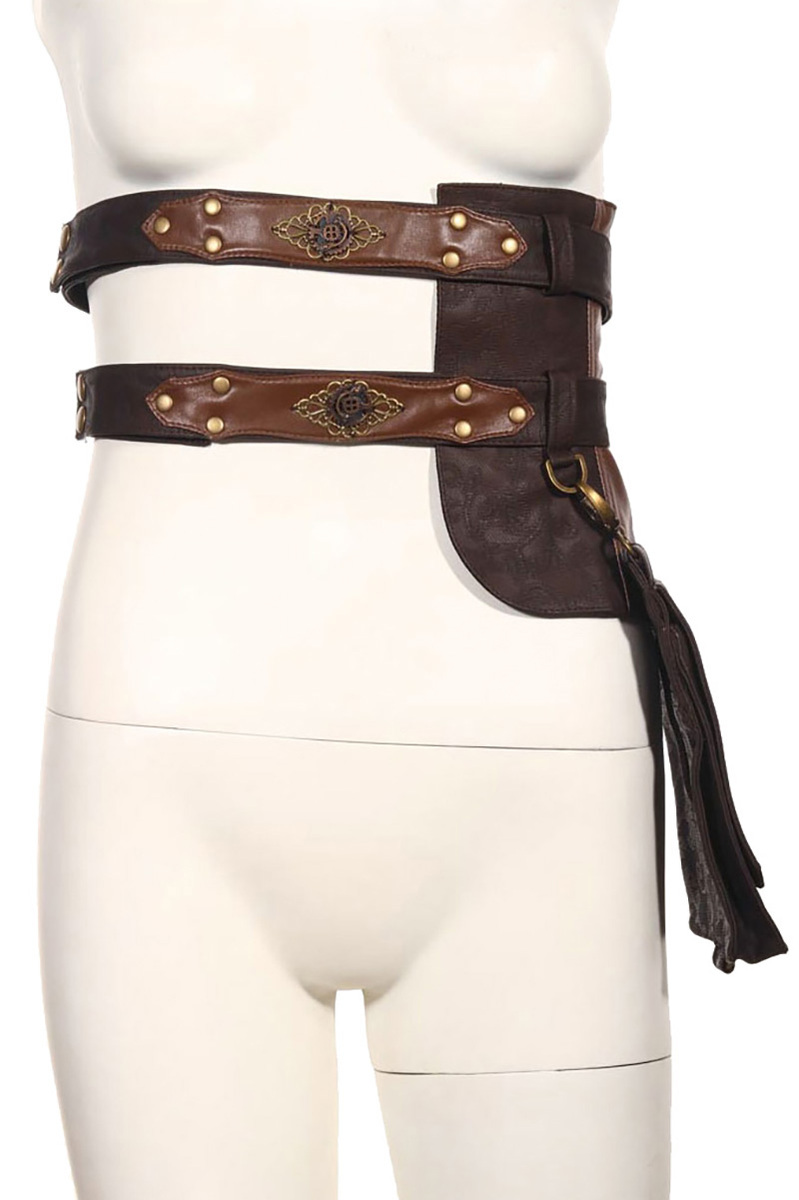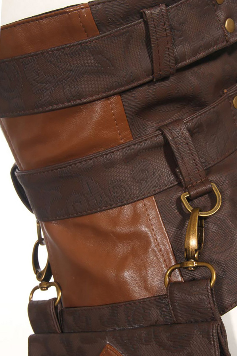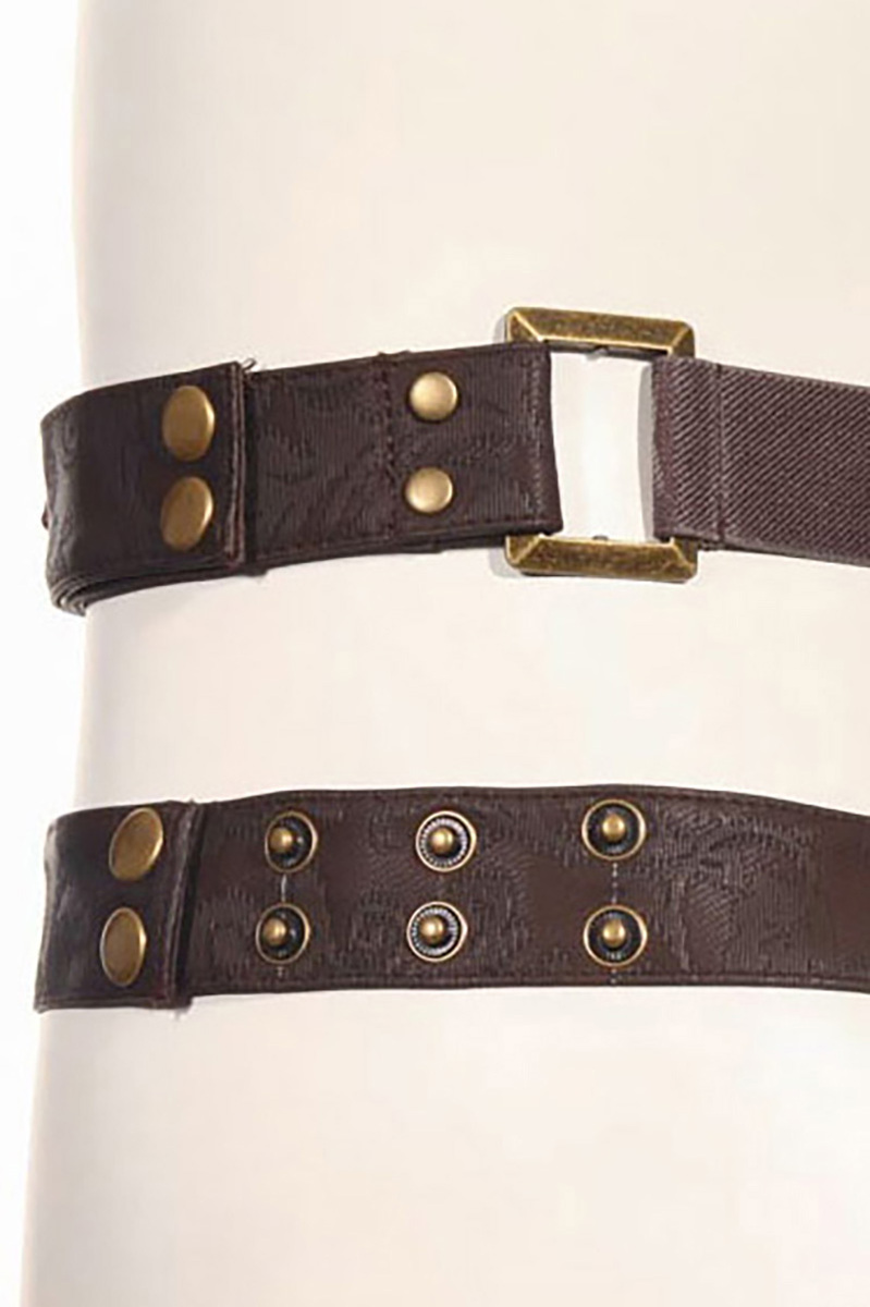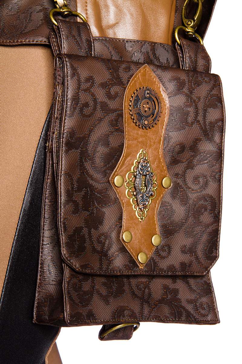 Steampunk Beintasche für Damen in Spitzen-Qualität, abnehmbare Klappentasche mit Klettverschluss. Die Tasche ist am Bein und Hüftgürtel mit Druckknöpfen verstellbar und hat mechanische Zierelemente sowie Nietenbesatz und Kunstleder-Einsätze.