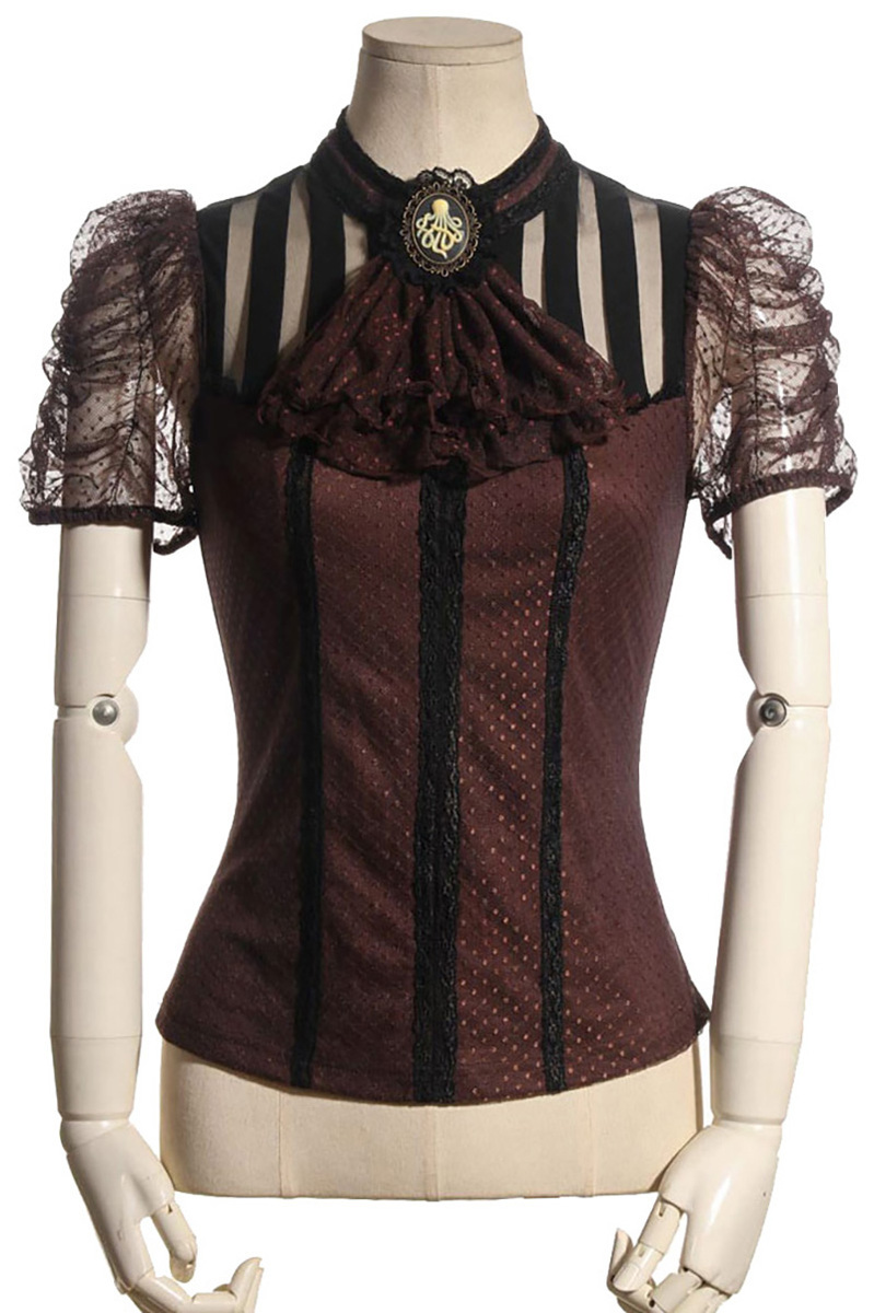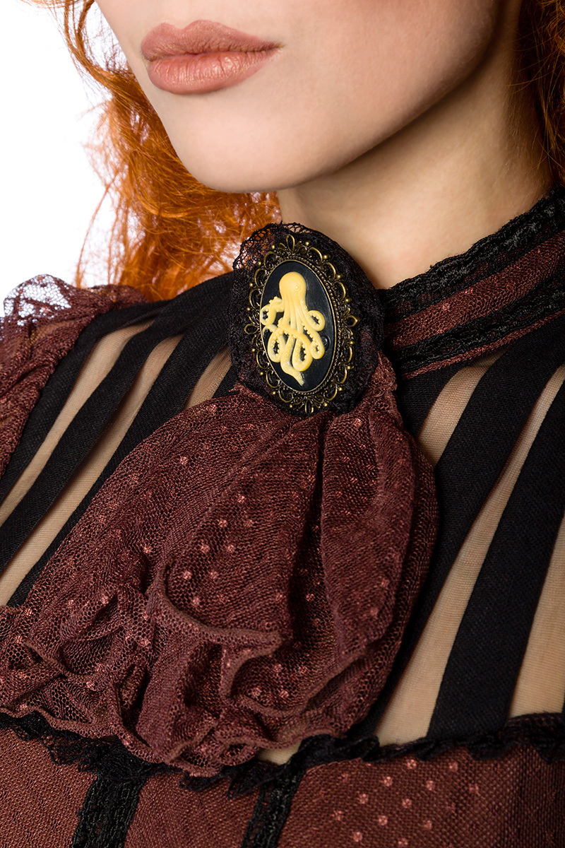 Produktinformationen "Braune Spitzenbluse mit Netzelementen Oktopus Brosche und Spitzenjabot Steampunk"