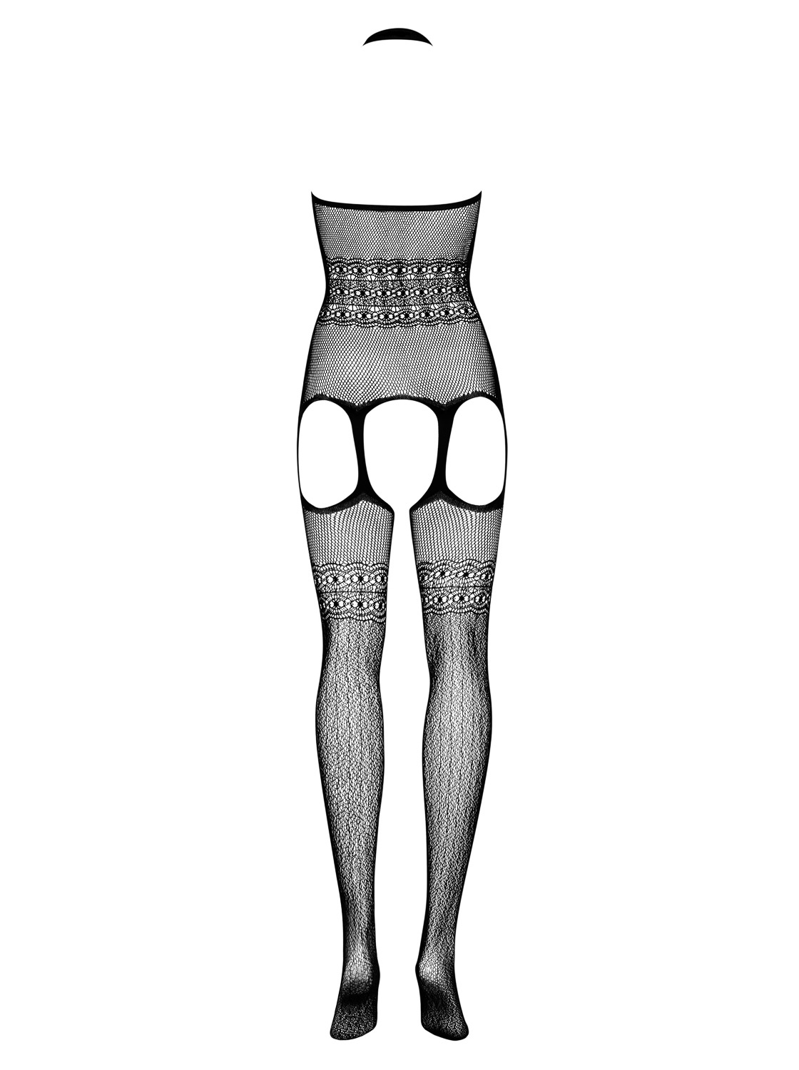 Elastischer Bodystocking, der sich aus einem Top und angeschlossenen Strapsstrümpfen zusammensetzt. Mit großen Musterdetails im Taillenbereich sowie einem Rollkragendetail. Mit offenem Schritt!