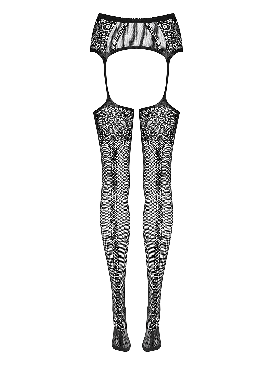 Schwarzer Strumpfhaltergürtel mit fest verbundenen Strümpfen. Mit dezentem Blumenmotiv und breitem Gummibund an der Taille für perfekten Tragekomfort. Im Schritt offen für leidenschaftliche Verführerinnen. Mit subtilen und femininen Verzierungen an den Oberschenkeln sowie einem vertikalen, figurschmeichelnden Muster auf der Rückseite. Weiches und elastisches Material.