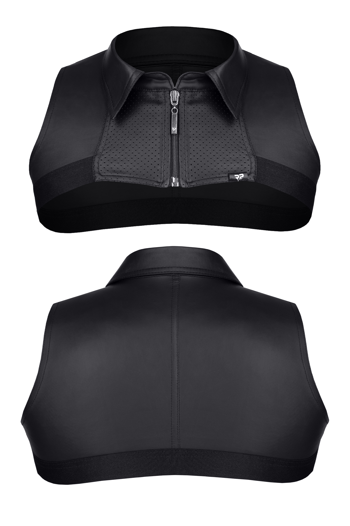 Crop Top mit dekorativem dunklem Reißverschluss vorne. Aus schwarzem Wetlook. Dekoratives Element aus perforiertem Wetlook vorne. Der Kragen ist gepolstert. Schwarzes, breites und angenehm anzufassendes Gummiband unten.