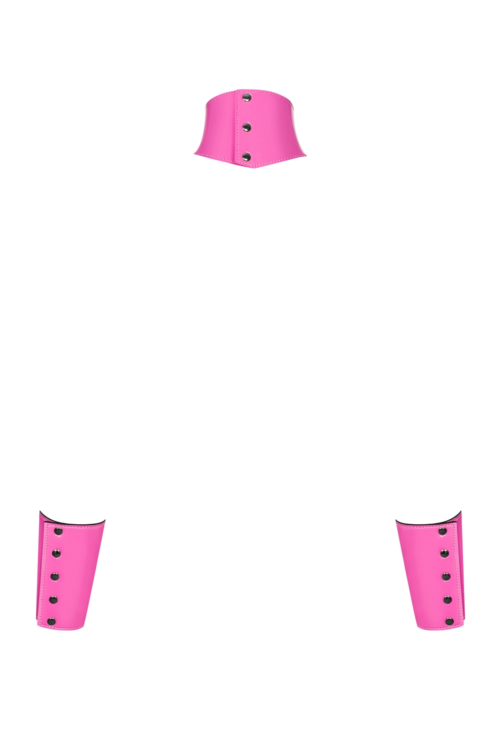 Lack Handschellen aus glänzenden und elastischem Wetlook Material mit Pinkem Kunstleder Halsband und jeweils zwei Ringen sowie verbunden mit Halsband. Die abnehmbare Kette verbindet die Handschellen und Halsband miteinander