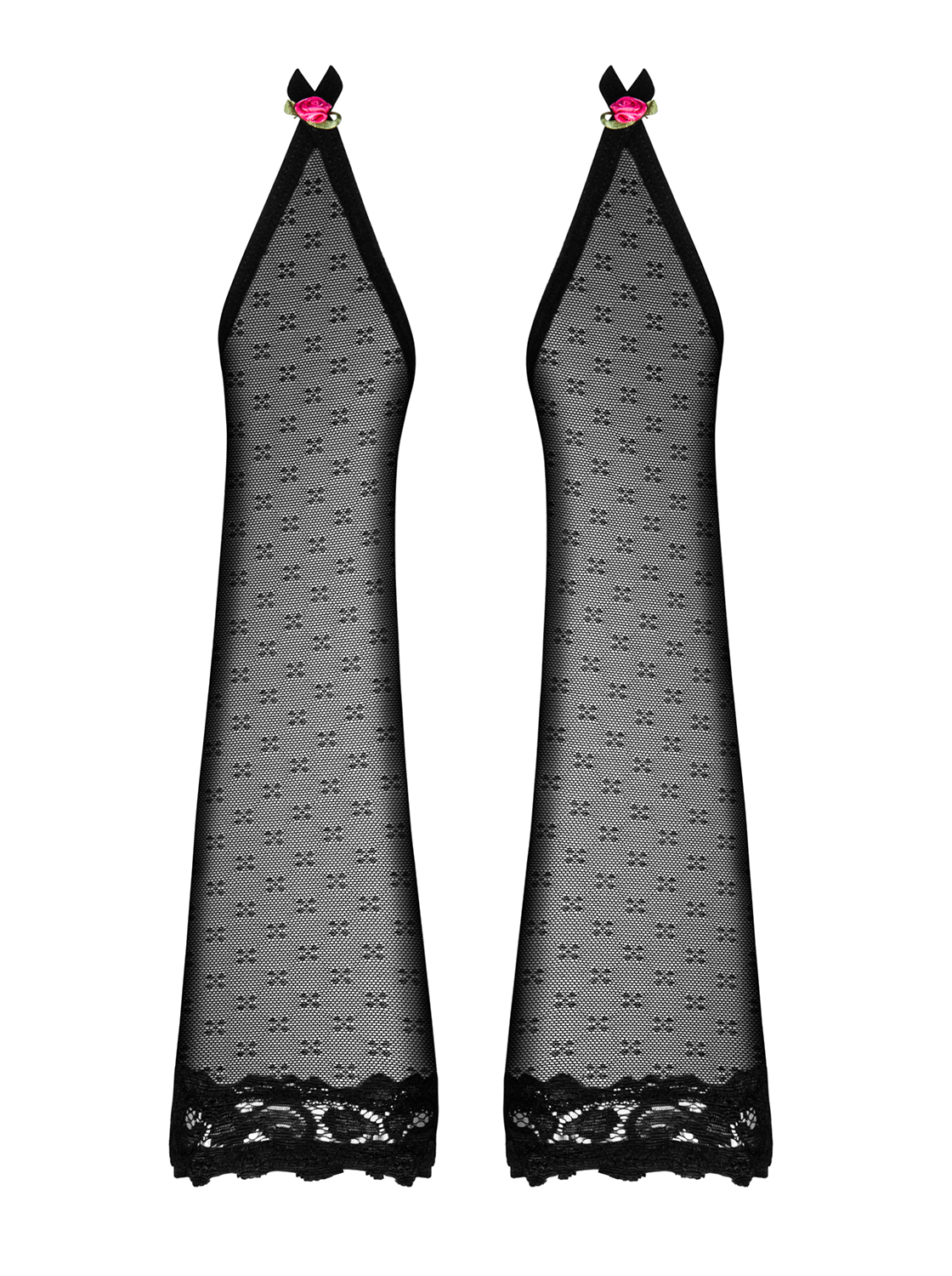 Sexy Spitzenhandschuhe als ideale Ergänzung für Ihr verlockendes Outfit. Aus elastischem Mesh-Material mit Blumenmuster. Perfekte Passform und ansprechendes Design. Die Fingerschlaufe hat ein dekoratives Rosenelement.