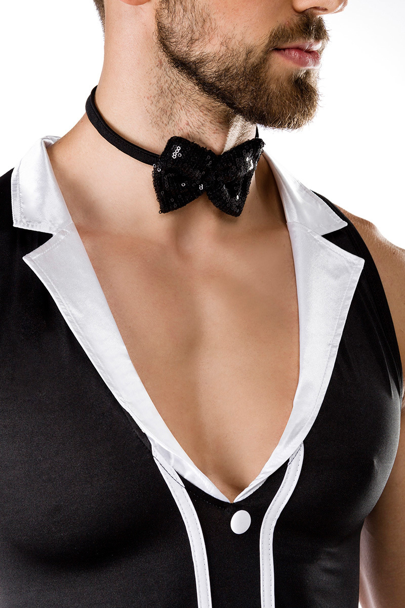 Herren sexy schwarzes Barkeeper-Kostüm mit Slip schwarzer Fliege Manschetten und Weste Roleplay Verk