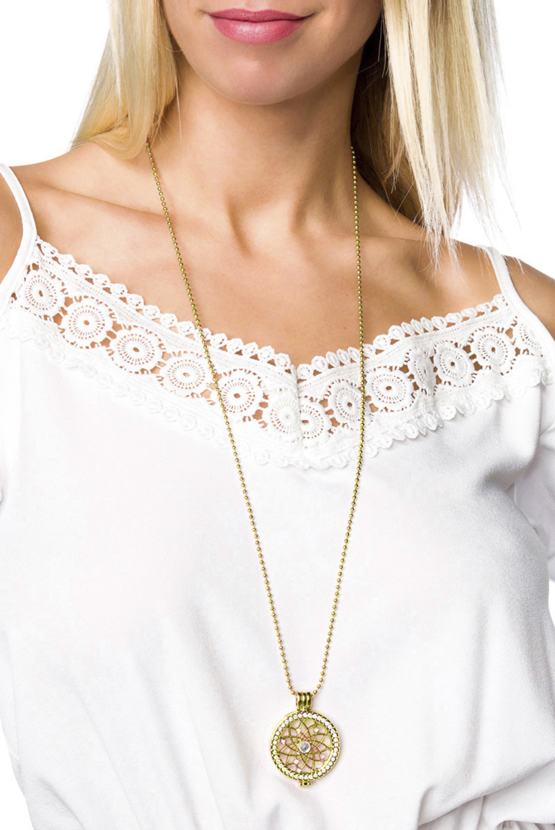 Hübsche Kette mit Medaillon, schmale Kugelkette mit Karabinerverschluss, Medaillon mit Strasssteinbesatz, wechselbares Einlegeplättchen mit Strass, Kettenlänge ca. 78 - 83 cm, Pflegehinweis: mit feuchtem Tuch abwischen