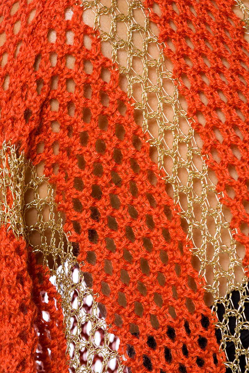 Produktinformationen "Oranger grobmaschiger Strickpullover mit Fledermausärmeln und goldenen Streifen transparent Onesize"