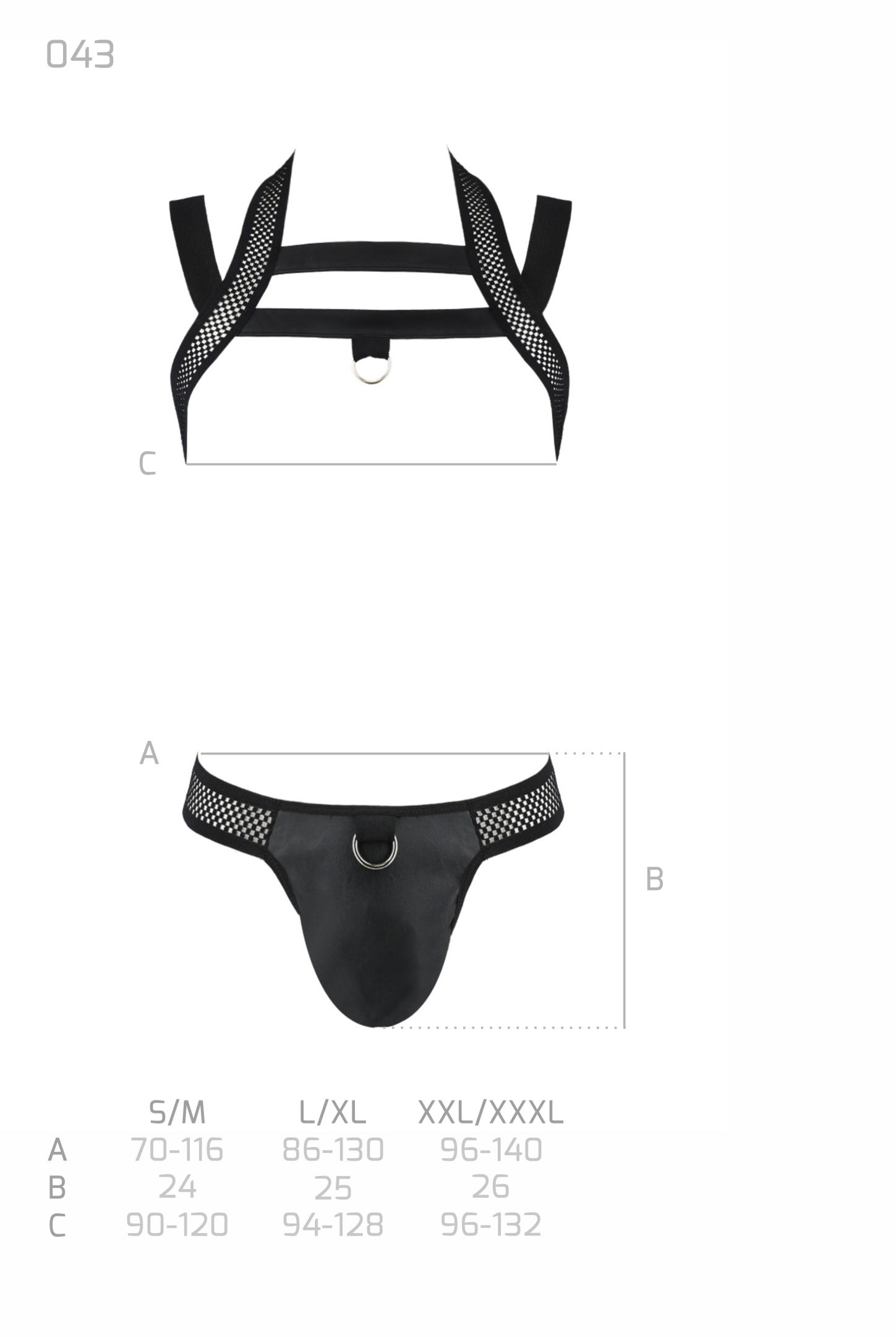 Erotisches Herren Dessous Harness Set gefertigt aus mattem Kunstleder und Gummibändern, mit Netzeinsätzen. Jockstrap und Top haben eien Metallring au der Vorderseite, perfekt für eine Kette.
